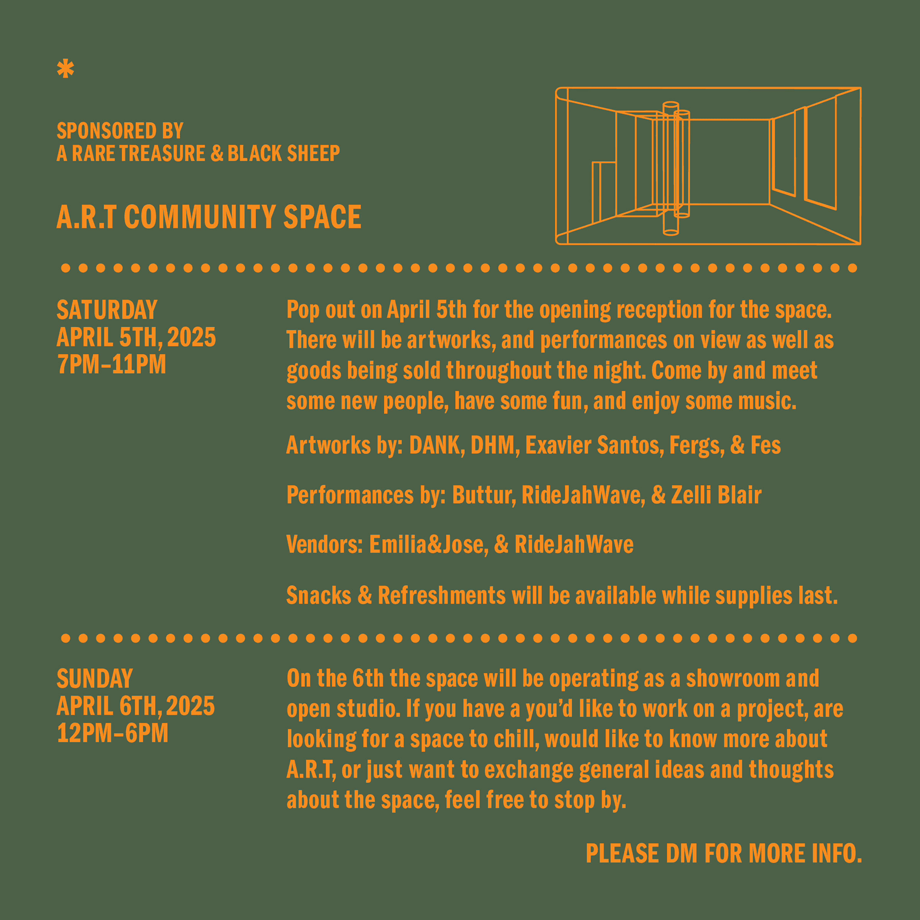 A.R.T (A Rare Treasure) Community Space was a two day collaborative event meant to foster community among and showcase the work of fellow friends and creatives while also providing a third space for people to congregate, chill, and hang out with fellow creatives, as a way to fight back against the steady decline of third spaces in our world.